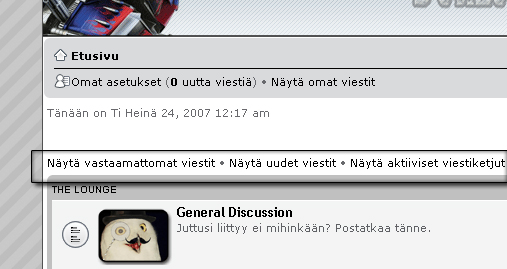Kyllä on itse asiassa, joskin aika huomaamattomana siinä etusivulla *edit* ylävasemmalla. Rantakemiasta minun näytölläni noin puolitoista tuumaa alaspäin. "näytä uudet viestit" *edit*