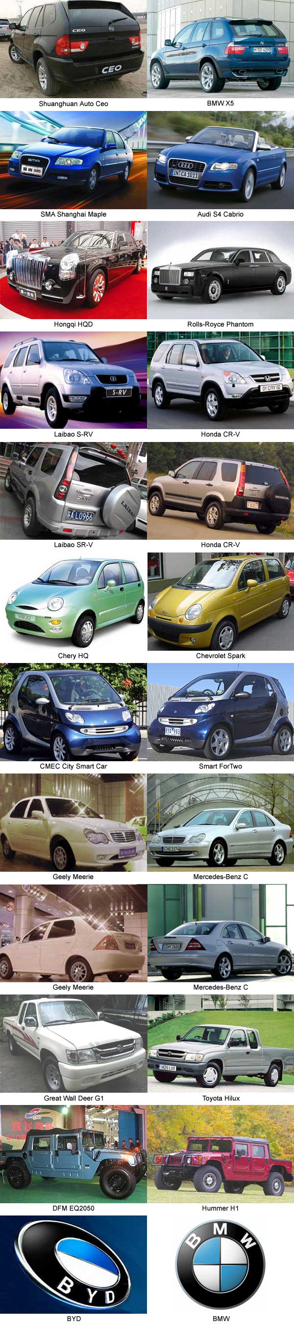 Eikö Kiinassa piraattikopioiden valmistaminen ole monessa tapauksessa laillista ja jopa valtion rohkaisemaa? Olisivat edes keksineet noille fiksummat nimet. Esim. Toyota Hilux = Great Wall Deer G1...